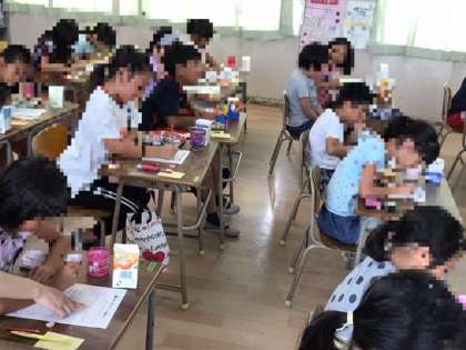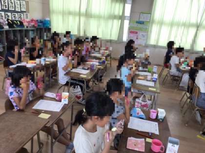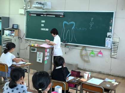 4年生は、フッ化物塗布の大切さと歯の健康について学習します。鏡を見ながら全部の歯の磨き方の練習です。歯ブラシの持ち方に気をつけて歯と歯茎の境を磨きます。