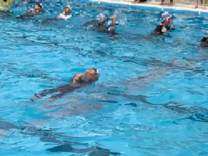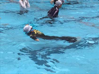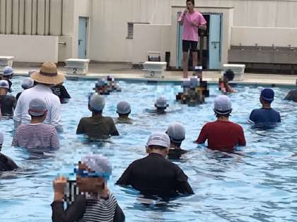 18日に5.6年生が着衣水泳の授業を受けました。服を着たままで水に入ると、どれくらい重くなるのかを体感しました。命を守るためには、上を向いて浮く、ペットボトルは浮くために役に立つことなど学習しました。