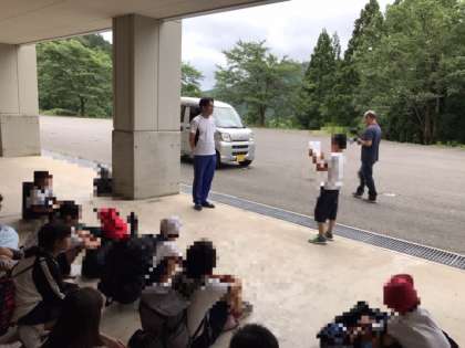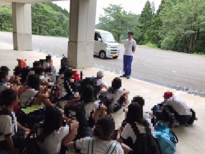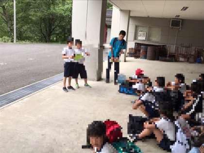 予定通り川遊びの近くの駐車場に着きました。開舎式をして、宿舎の方にお世話になる挨拶をしました。これから2泊3日の林間学習の始まりです。