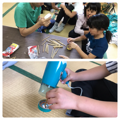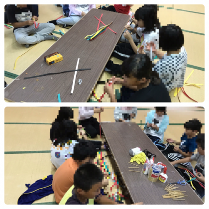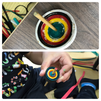 雨プログラムの2つ目。コマ作りは、カラーの紙をどんどん芯に巻いていきます。巻き終わったらボンドをつけて、ドライヤーで乾かすと完成です。集中力が身につきます。