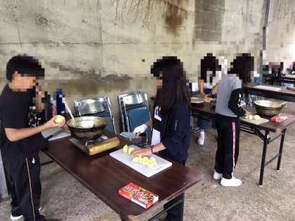 雨が止まないのでお昼のカレー作りは屋内になりました。野菜を切って、カレーを炊く係とおかまでご飯を炊く係に分かれて作りました。