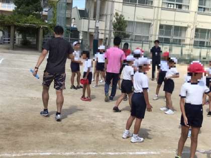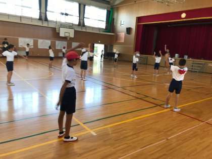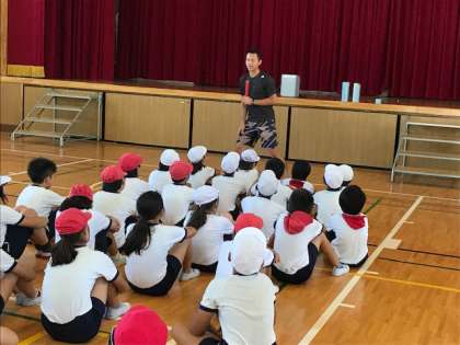 1学期に続き、元走り幅跳びの選手でいらした荒川大輔さんにお越しいただき、陸上の夢授業をしていただきました。最初は講堂でウォーミングアップで、陸上競技の体の動かし方を学びました。