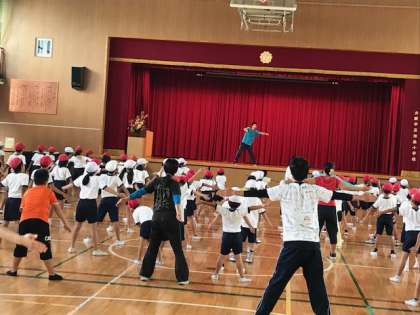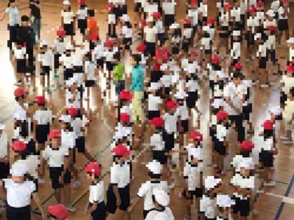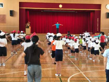 今朝の集会は、運動会に向けてラジオ体操の練習です。ひじを伸ばして、ビシッとした体操になるように練習をしました。教室に向かう時には、回れ右も確認しました。