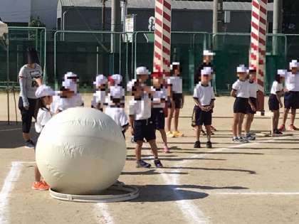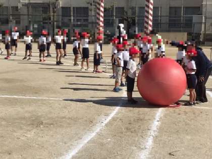 今朝の全体練習1回目では、入場行進、ラジオ体操を行ってから、全校競技の大玉転がしをしました。白組も赤組も真剣に練習していました。