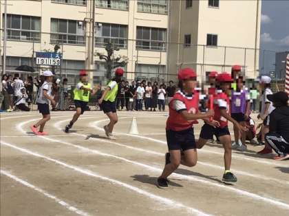 5.6年生のリレーはさすがの迫力でして。今年は、バトンをもらう手を左に変えました。なかなか難しいのですが、上手にパスできていました。