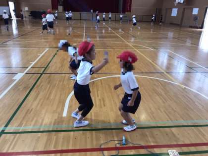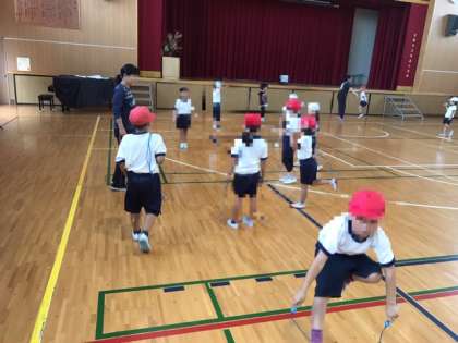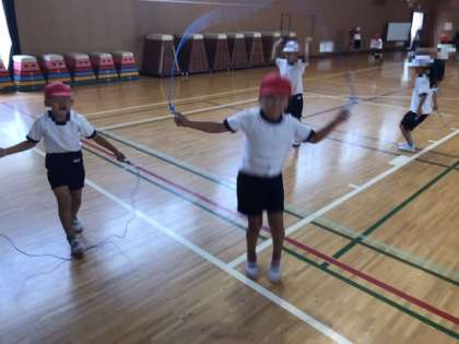 1年生がなわとびに取り組んでいました。前跳び、後ろ跳び、あやとび、2人組跳び、色々な跳び方に挑戦していました。みんなとっても上手で、これからもっと色々な技に挑んで欲しいです。