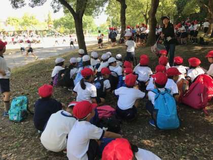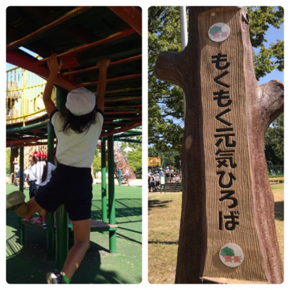1.2年生の遠足は、久宝寺緑地です。今日はたくさんの学校のお友達も来ていました。もくもく元気広場で仲よく遊びます。
