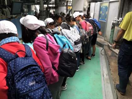 回遊魚の餌やり体験もしました。カンパチやサメなどにアジの切り身をやると、勢いよく食べに来ます。