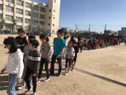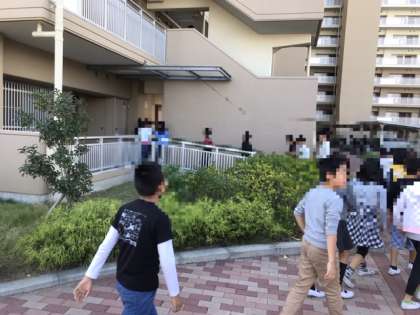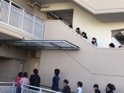 津波の襲来を想定して、二次避難として近隣の高層階まで避難します。とにかく静かに行動できていました。