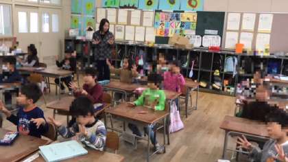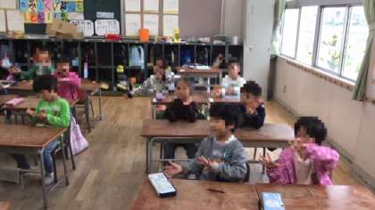 1年生が、グーチョキパーで姿勢体操をしていました。毎日しています。保健委員会の人に教えてもらった体操です。とってもいい姿勢になれていました。