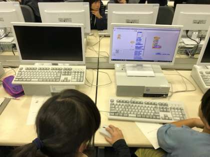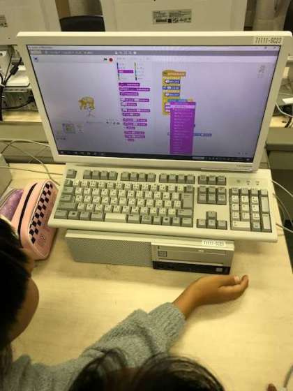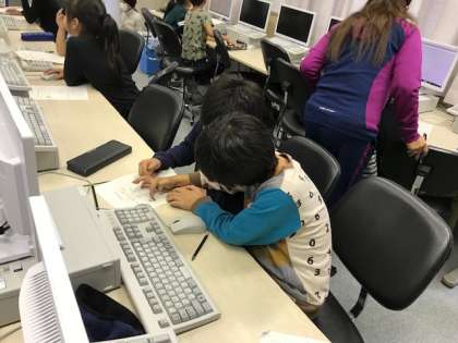 3年生は、パソコンルームでプログラミングの学習をしています。ソフトを使って思い通りにアニメを動かす学習です。2人1組で相談しながら進めていました。