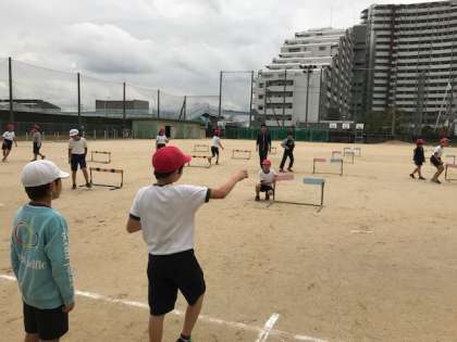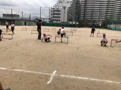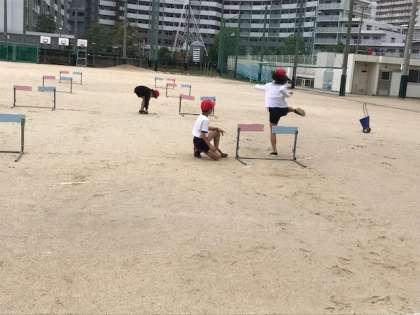 5年生がハードル走の学習をしていました。ハードルの横から踏切位置や空中の姿勢をみながらアドバイスしていました。