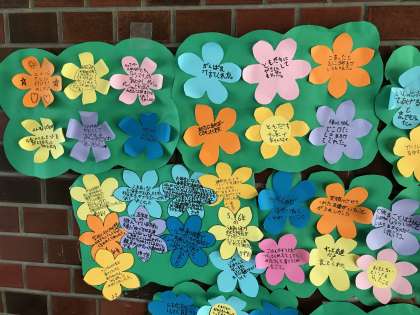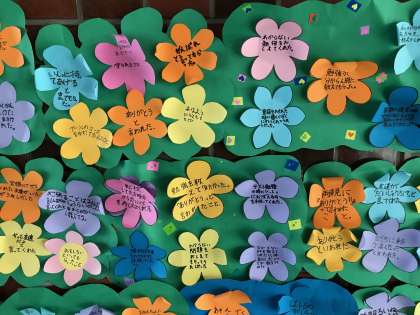 お友達に言われてうれしかった言葉をたくさん集めました。お友達を大切に思っている言葉がたくさん集まっています。こんな言葉であふれる学校は素敵です。