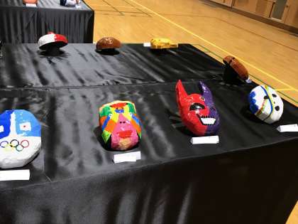6年生の立体作品は、「お面」です。様々なお面が展示されています。ていねいにていねいに和紙を重ね、色を重ねて作りました。