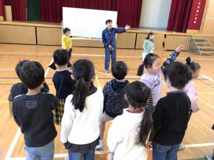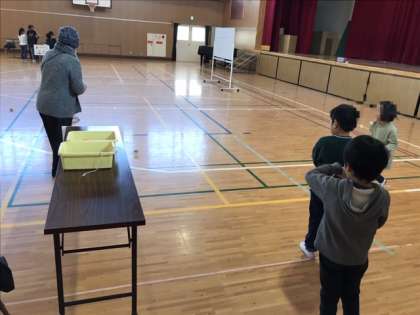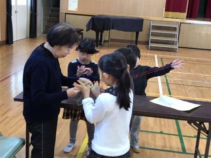 今日は、地域のみなさんにお越しいただき、こま回しやあやとりを教えてもらいます。なかなか思うようにできないようです。