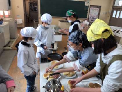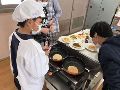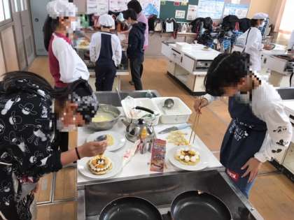 6年生が調理実習でパンケーキを焼いていました。家庭科室は美味しい匂いで満たされていました。グループごとに大きさやデコレーションを工夫して、とっても美味しそうです。