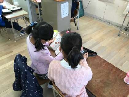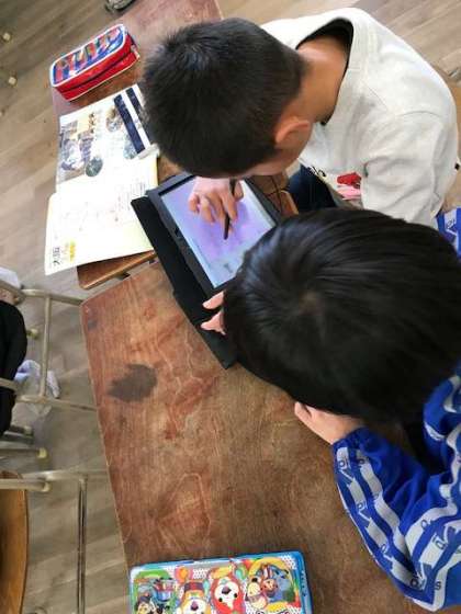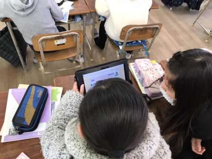 3年生がタブレットPCを使って社会科の調べ学習をしていました。昔の道具を写真やテキストでしらべます。2人1組で協働学習ができていました。