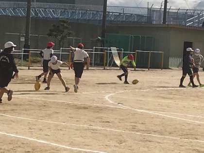 5年生がタグラグビーをしていました。体をコントロールしてタグを取られないように走ります。ワンチームでトライできるかな。