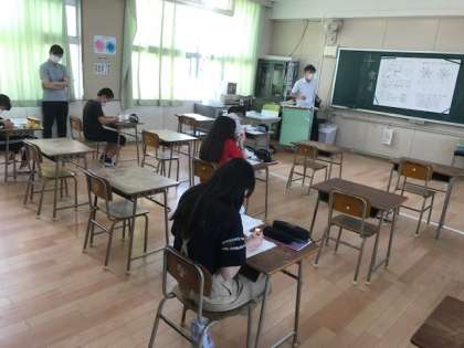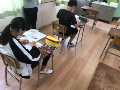 6年生は、家庭学習のプリントを使いながら算数「対称な図形」の学習内容の確認をしていました。図形の中に対称の軸を書き込んで対称な図形の性質を調べていました。
