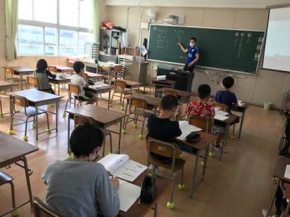 4年生の今日の学習は算数です。筆算を使った割算で、2桁割る1桁の割算の余りが出る計算です。「たてる、かける、ひく、おろす」を確認して計算します。