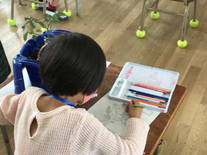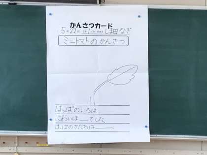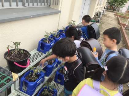 今日の2年生の学習は、生活科で育てているミニトマトの観察です。観察カードに、葉や茎の様子をよくみて描きます。花のつぼみを見つけている子もいました。その後、学習園のミニトマトに水やりをします。「トマトのにおいするで」と喜んでいました。
