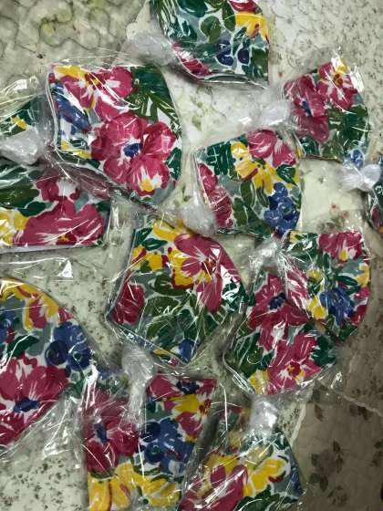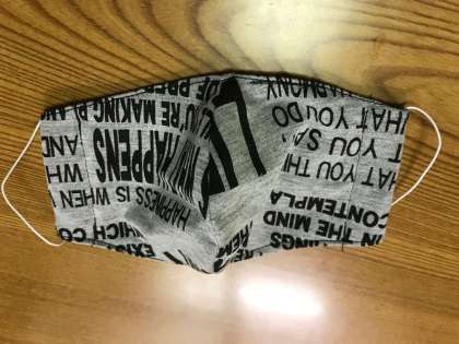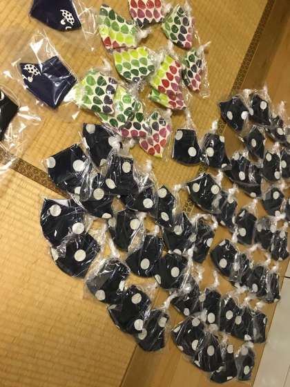これはマスクです。大量のマスクです。給食調理員の須田さんが、池島小学校の児童の皆さんのために作ってくださいました。すごい数です。皆さんを新型コロナウィルスから守ってくれる大切なマスクです。来週、皆さんに配ります。須田さんにお会いしたら必ずお礼を言ってください。