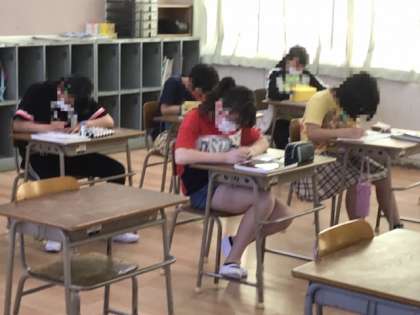 6年生が、臨時休校以来初めて2クラスの子供たちが登校しました。少しおしゃべりをできる人が増えたようですが、まだまだ静かに過ごすことが多いです。1組は対称な図形のプリント学習、2組は漢字テストに取り組んでいました。