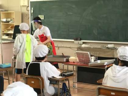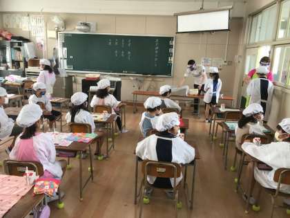 今日から給食が始まりました。子供たちも待っていたようです。しばらくは先生が配膳します。フェイスシールドをつけて、手袋もつけて、感染対策しながらの準備です。子供たちも協力して、待っていたり取りに行ったりできていました。