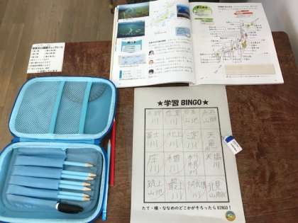 日本の山地、山脈と河川の名前を使ってビンゴです。最近学習した、名前を覚えてビンゴカードに書いて、ビンゴを楽しんでいました。社会科では、漢字をきちんと書きます。