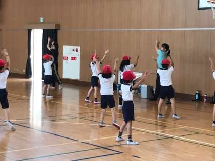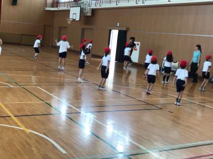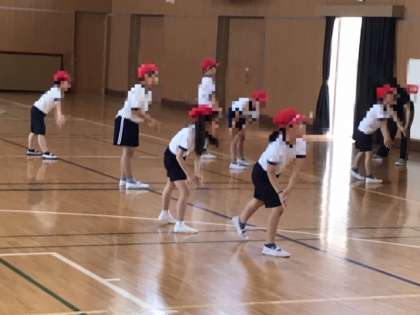 2年生はリズムダンスの学習をしていました。アップテンポな曲に合わせて、ダンシング!体育は友達と離れて行うので、マスクはしなくてもよいことになっています。