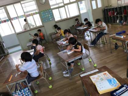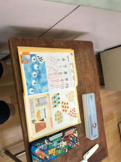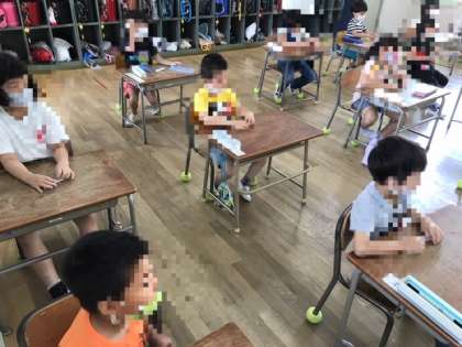 「5は1と4」「5は2と3」何回も何回も勉強します。おはじきを使って、数の概念を体感的に学びます。数学の基礎になるとても大切な1年生のスタートです。