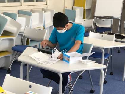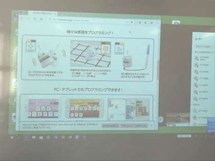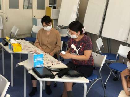 プログラミング用ロボットの研修をしています。タブレット端末と繋いで動かしたり、音や光を出させたりします。どんなプログラムでロボットがどのように動くのか、子供たちより先に試して研究です。