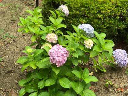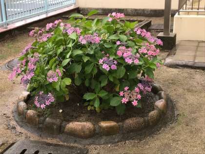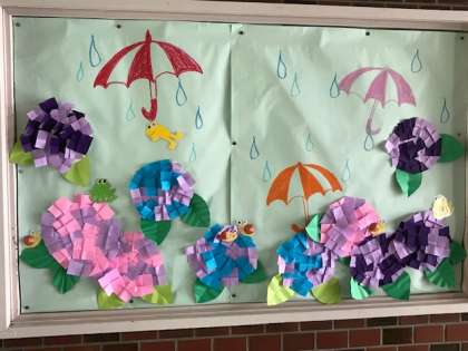 今日は傘の日だそうです。雨にはアジサイの花が映えます。6年生が作ったアジサイの掲示物からま雨音が聞こえそうです。