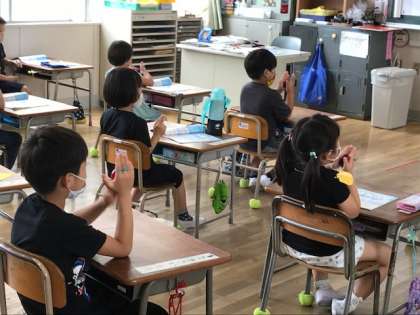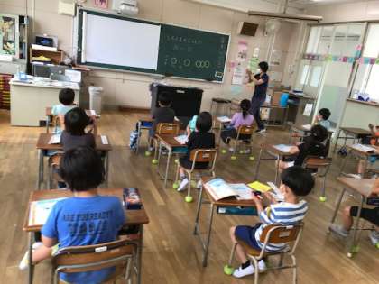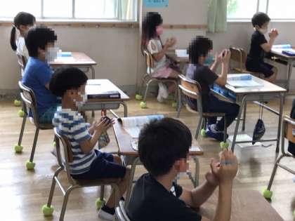 1年生が音楽でリズム遊びをしていました。カスタネットを上手に使って、白くまのジェンカで「たん うん たん うん たんたんたん うん」と音を1つにしていました。