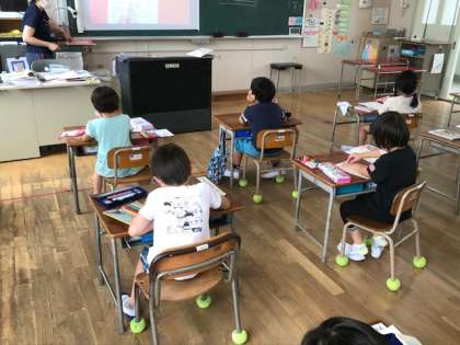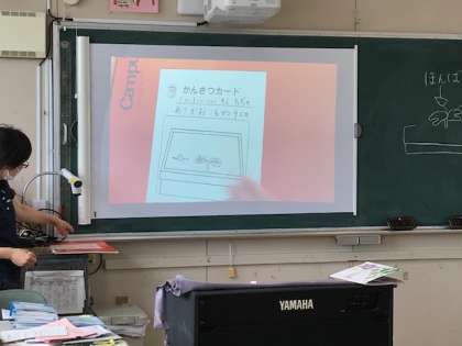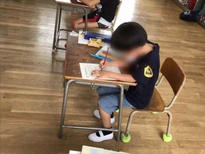 1年生がアサガオの観察カードを作っていました。見つけたふたばの色を塗っていました。くきの部分の色は葉っぱと違うことに気付いて塗り分けている子もいました。すごい観察力です。
