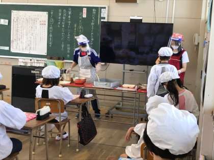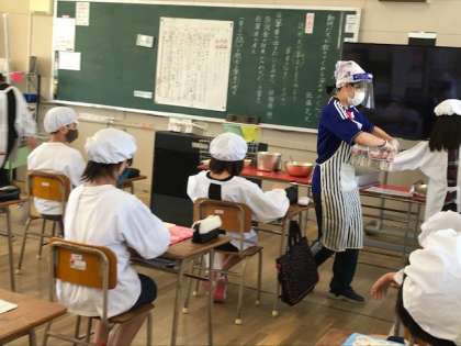 15日月曜日から、簡易であった給食は元通りの献立に戻りました。3密を避けるためにまだしばらくは教員による配膳を続けています。フェイスシールドは必需品です。