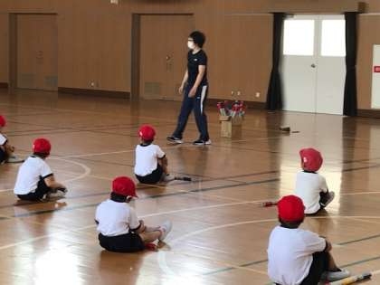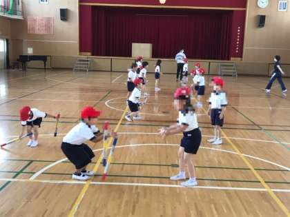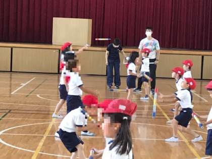 1年生が新聞紙を丸めた棒(コグトレ棒)を使って身体の使い方の学習をしていました。棒をうまく扱う、友達とタイミングを合わせる。1年生にとってはかなり難しい課題に取り組んでいました。
