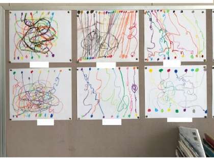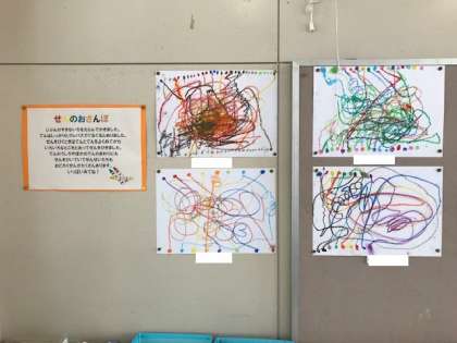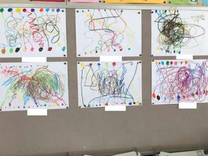 1年生の線描きの学習です。いろいろな色のパスを使って、ゆっくりゆっくり線を描きます。できた駄句品は、かなりの芸術作品です。