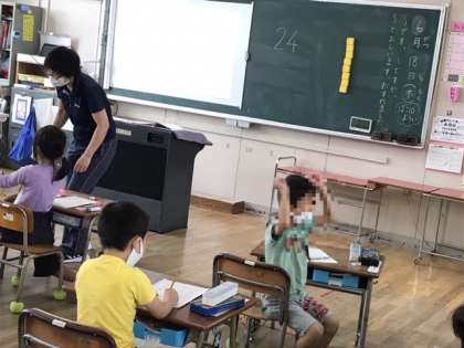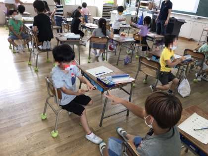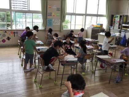 1年生が7を作っていました。お友達との距離は取りながら、出した指が4と3で7 2と5で7