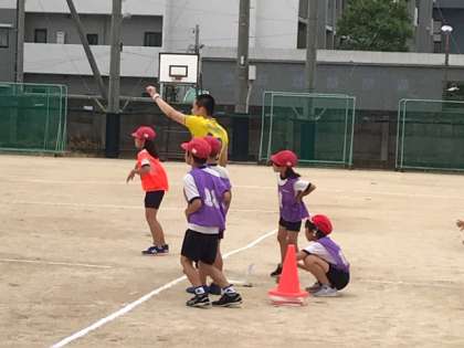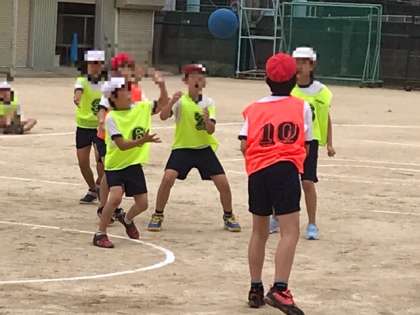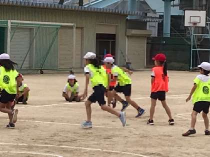 4年生の体育はパスをつなぐゲームです。ボールを持っている人は動かないので味方がスペースを探して動きます。密にならないように動くのは難しいです。