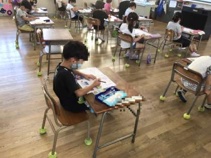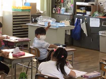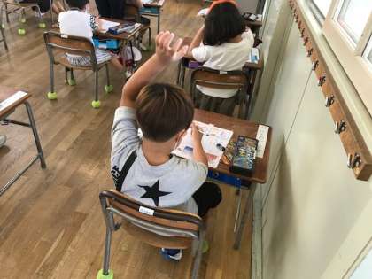 1年生がひらがなの「の」と「も」を学んでいました。ゆっくり丁寧に書いて、できたら静かに手をあげて先生に知らせます。もうすでに学習の決まりを身につけている立派な子たちです。姿勢もとってもいいですね。