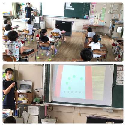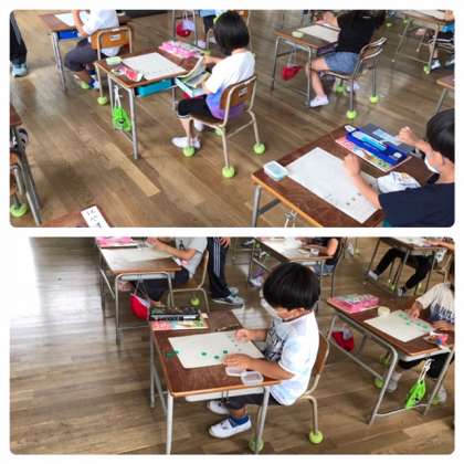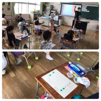 今日の1年生の算数は、おはじきとばしのゲームです。内山先生に教えていただきました。円の中に入ったおはじきの数を調べます。1つも入らなかったときは「0」を書きます。何もない時の0の意味を学びました。