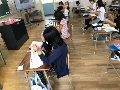 今日の5年生の課題は、ボタンつけとなみ縫いです。ボタンつけでは、最後の玉止めに苦心していました。針を抑えるのが少し怖くて緩んでしまったようです。