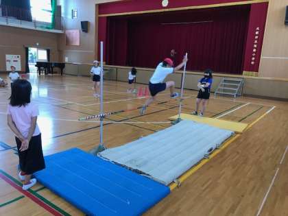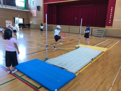 4年生の走り高跳びの学習を通して子どもたちの空中姿勢がかなり良くなりました。振り上げた足が高くあがるようになっています。