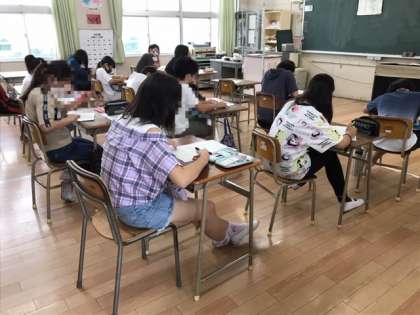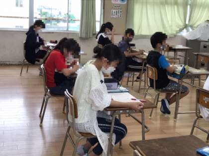 6年生の今朝の様子です。1組の子どもたちは算数のプリントをしており、2組の子どもたちはカードを作成していました。まさに雨にも負けずを実践しています。