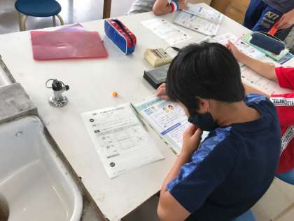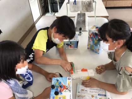 4年生が電流を見るために実験をしていました。簡易検流計を使うと、電流の強さと向きを目で確かめることができます。実験器具をつないで確かめていました。