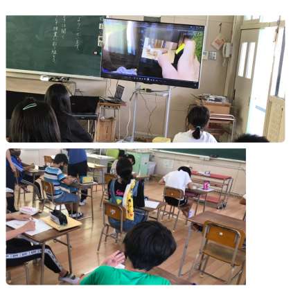 6年生1組は、医療従事者のみなさんに対するお礼の葉書を書いていました。6年生2組は、水泳の池江璃花子選手のリハビリから、医療のことを学んでいました。