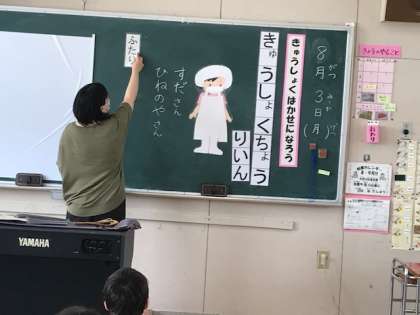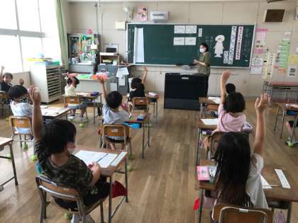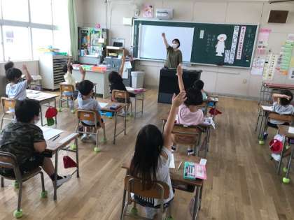 1年生は、食育の時間に「給食」のことを学びました。調理員さんは150人分の給食を作ってくれているのを知り、驚いていました。