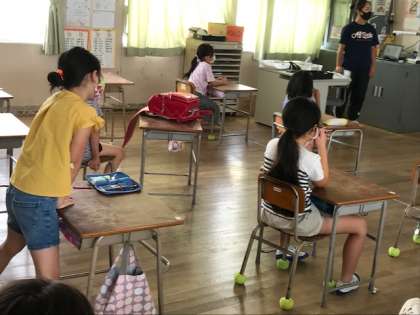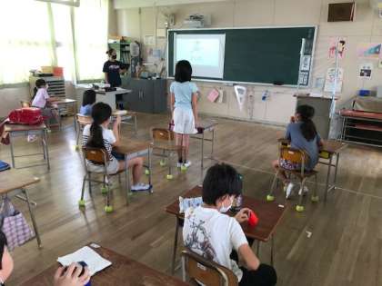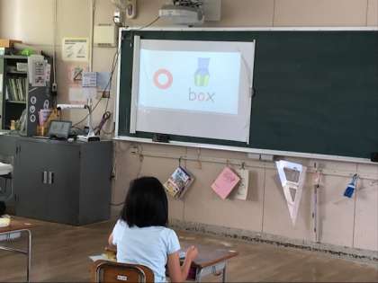 a.i.u.e.oの発音をフォニックスで習います。映像から流れる発音をよく聞いて、みんなで発音していました。Sunday.Monday…の歌も元気に歌えました。