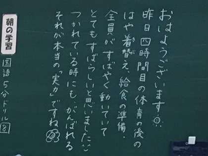 朝から黒板にこんなに褒めていただけるとやる気が出ます。5年生では、今、古文マスターを目指して、古典の有名な文章を覚えています。朝の会では、スピーチをして、国語の力が伸びますね。